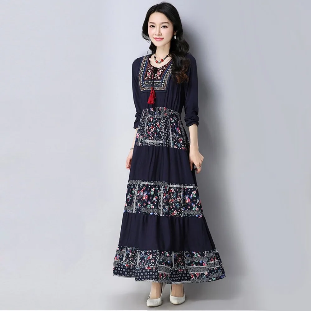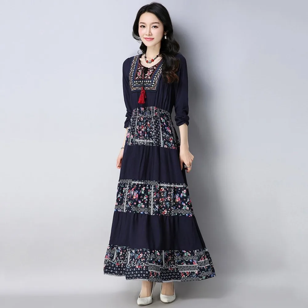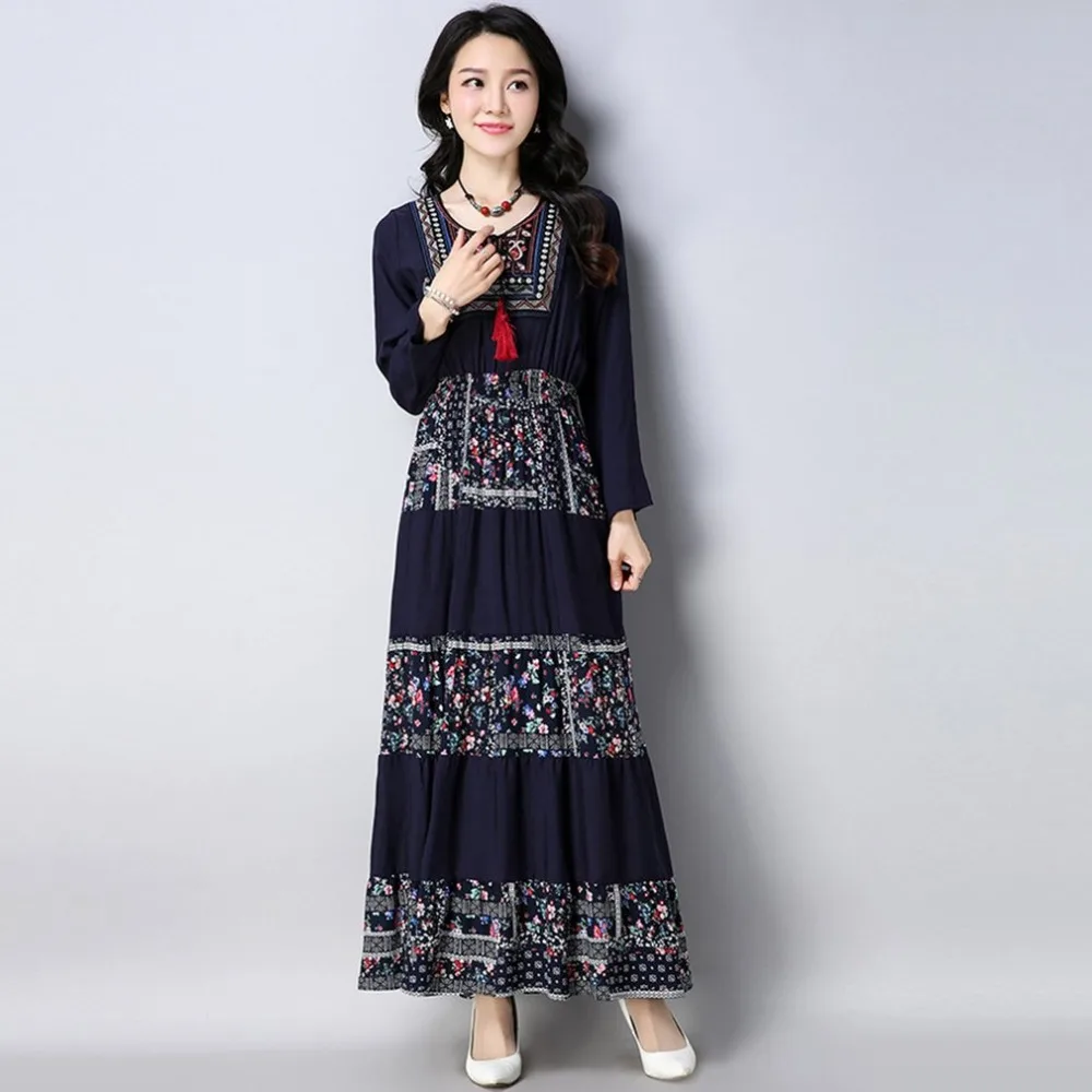 Plus SIizeWomen Dress Long Sleeve Long Length Floral Printed Dress Casual Loose Dresses Vintage Ele